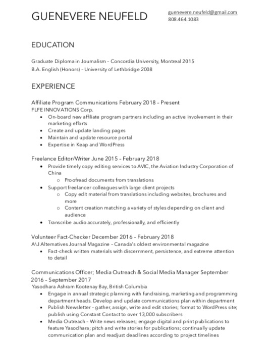 Guenevere Neufeld has a BA in English language and literature from the University of Lethbridge, and a graduate diploma in journalism from Montreal’s Concordia University. She spends as much time as possible near the sea.